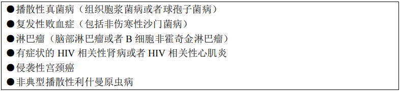 感染HIV后的終末階段?;颊逤D4+T淋巴細(xì)胞計(jì)數(shù)多<200個(gè)/μL。此期主要臨床階段表現(xiàn)為HIV相關(guān)癥狀、體征及各種機(jī)會(huì)性感染和腫瘤。